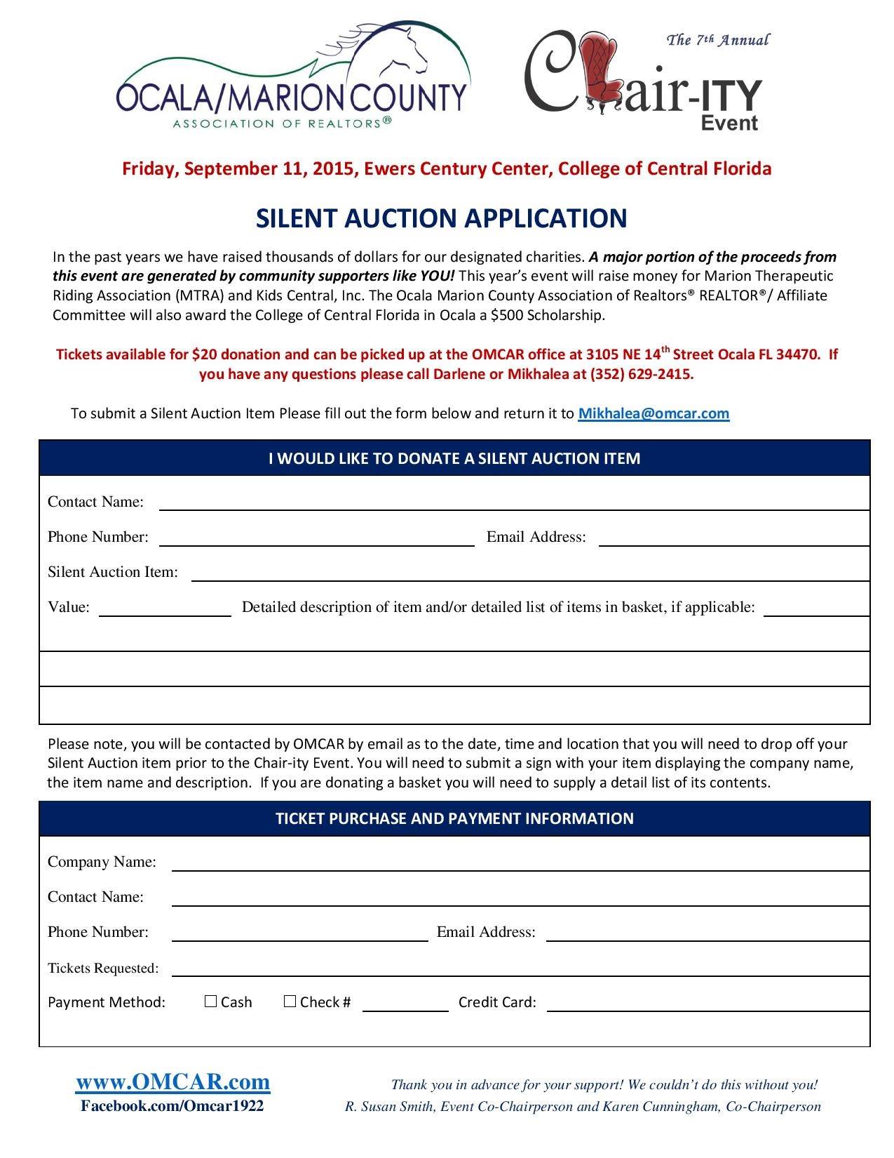 On Friday, September 11, 2015 beginning at 5:30 pm at the Ewers Century Center, the College of Central Florida, the Ocala/Marion County Association of Realtors® will be hosting their Seventh Annual CHAIR-ity Event, a tremendous evening that will benefit MTRA and Kids Central, Inc., two of Marion County’s most deserving service organizations. This exciting event features artistic, fun and whimsical chairs and other seating that have been creatively prepared to appeal to every taste a person can imagine. In addition, there will be plenty of assorted gift baskets in the Silent Auction. Last year, this event raised over $27,000 to help charities in need. Share this with your friends and help us raise money for our local charities in need! SPONSORSHIPS are available for $2,500, $1,000, $500 and $100. Click here for a sponsor form. If you would like to create a CHAIR FOR AUCTION or donate a SILENT AUCTION ITEM, Contact Mikhalea at 352-629-2415 or Mikhalea@omcar.com for more information, or click here for an Auction Item Submission Form. TICKETS available for a $20.00 donation. R. Susan Smith, Event Co-Chairperson Karen Cunningham, Co-Chairperson BUY YOUR TICKETS AT THE DOOR TONIGHT!
